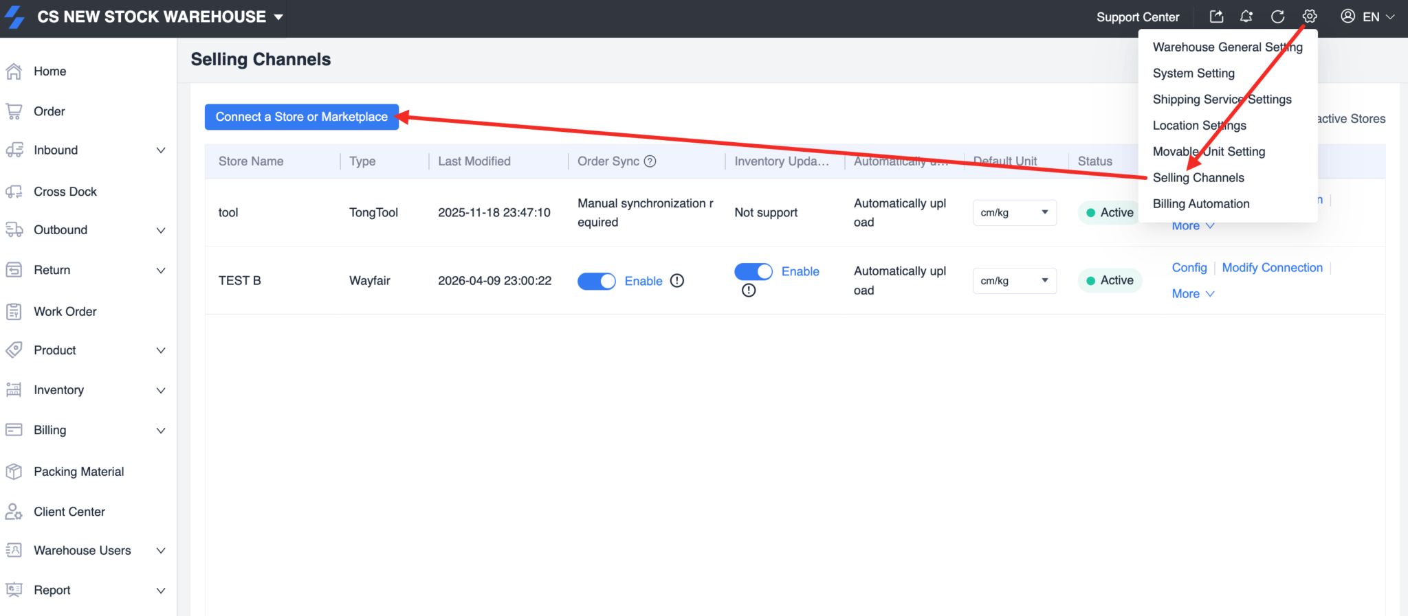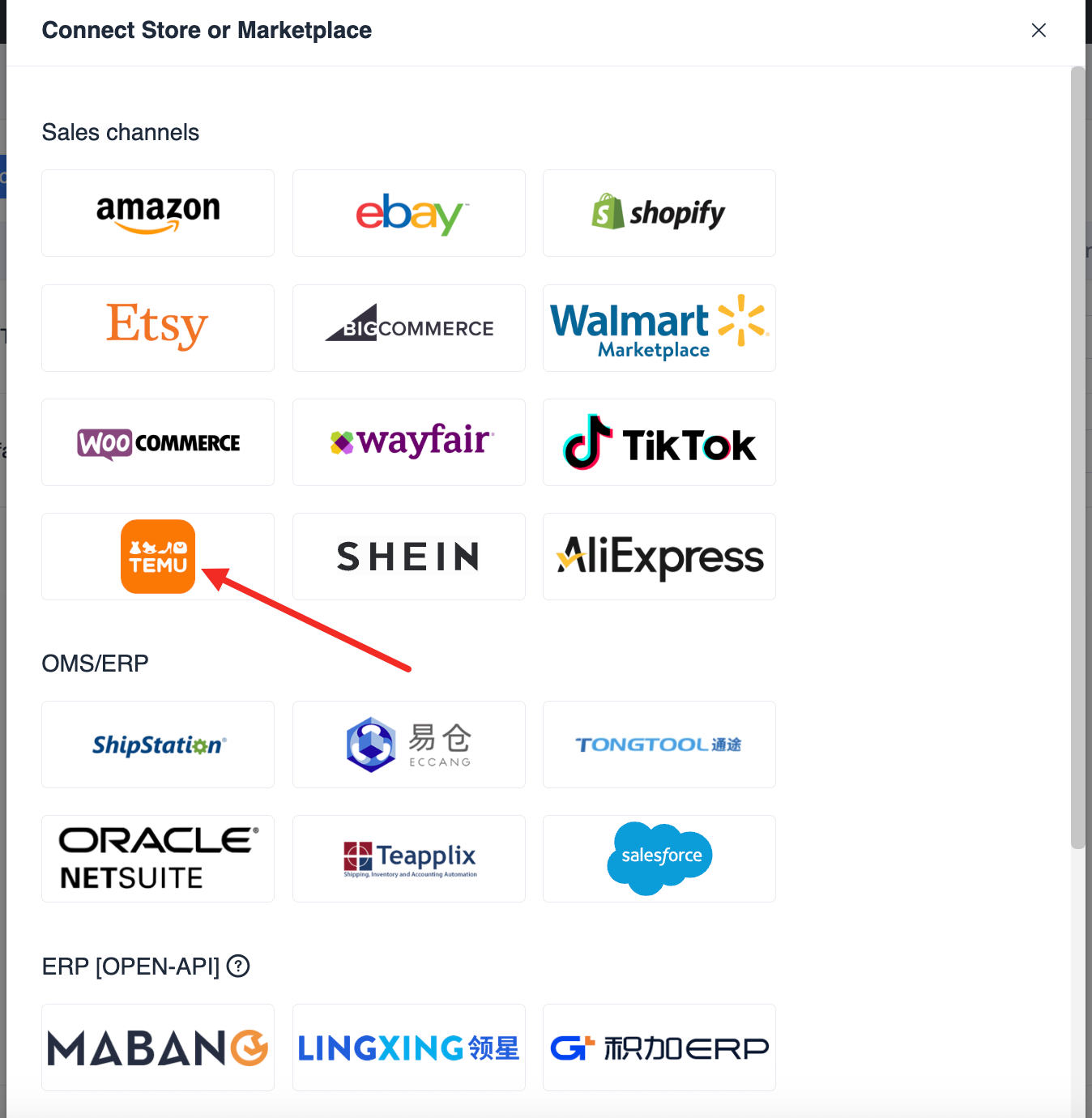 3.2 Go to Settings > Selling Channels in the top-right corner, then click Connect a Store or Marketplace. Find and select the Temu icon from the platform list.