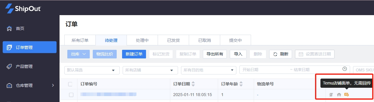 After clicking Online Order & Ship on Temu to purchase the waybill, the order status changes from To be shipped to Shipped directly. ShipOut pulls these shipped orders for warehouse fulfillment.