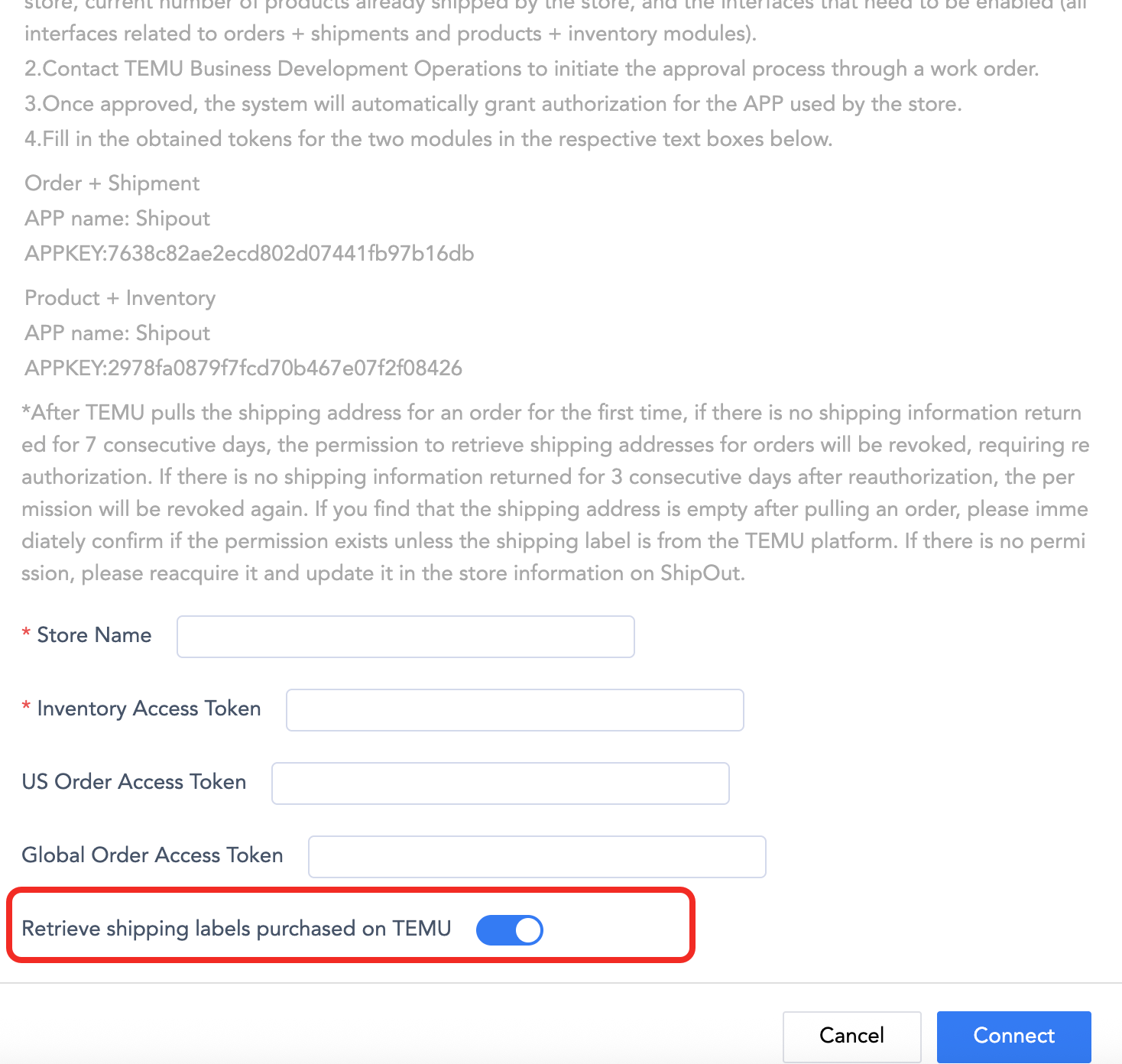 6.1 Enable toggled on “Retrieve Shipping Labels Purchased on Temu” when connecting the store.