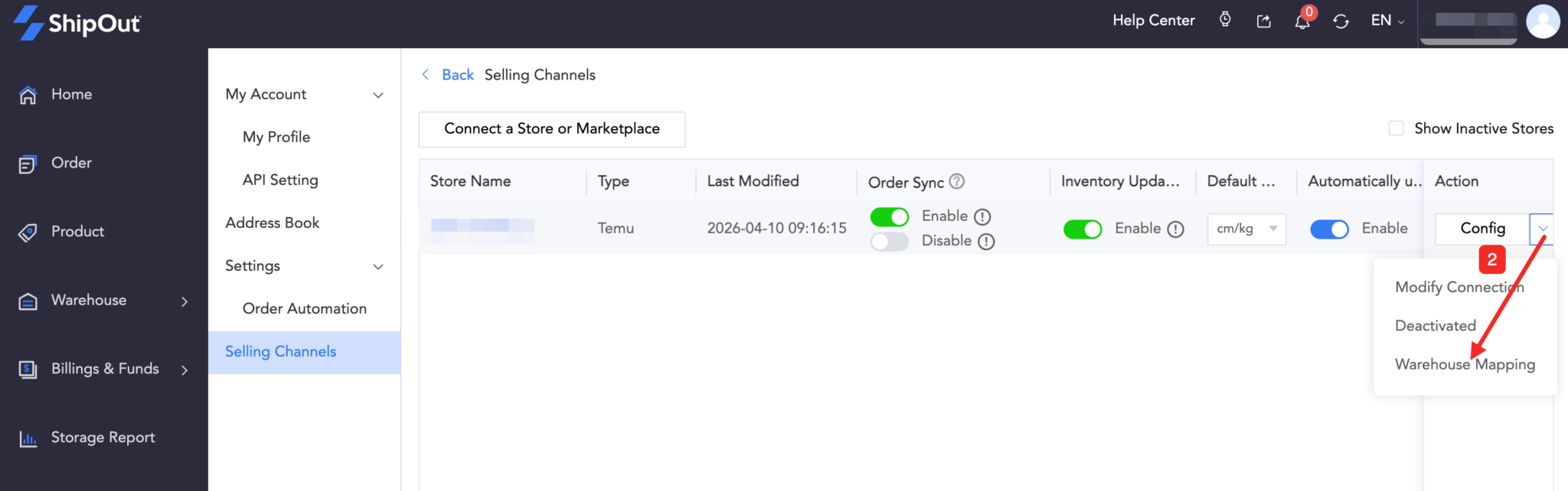 4. Go to Warehouse Mapping and select the ShipOut warehouse whose inventory you want to sync to your Temu warehouse.