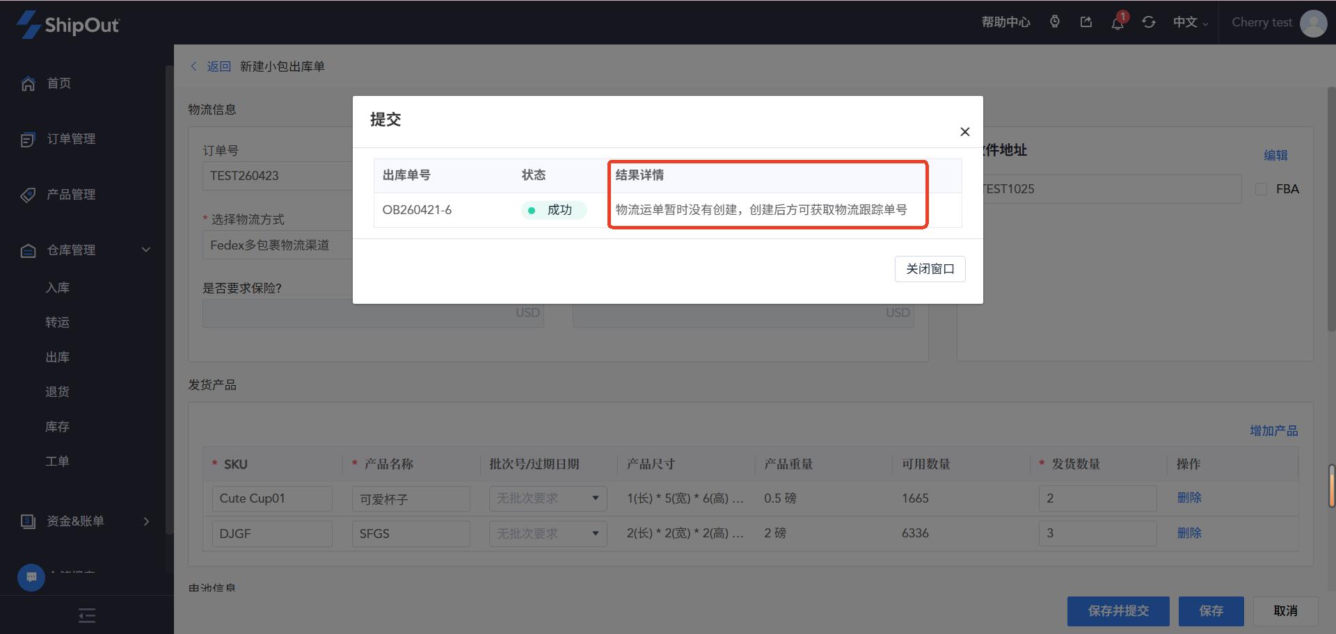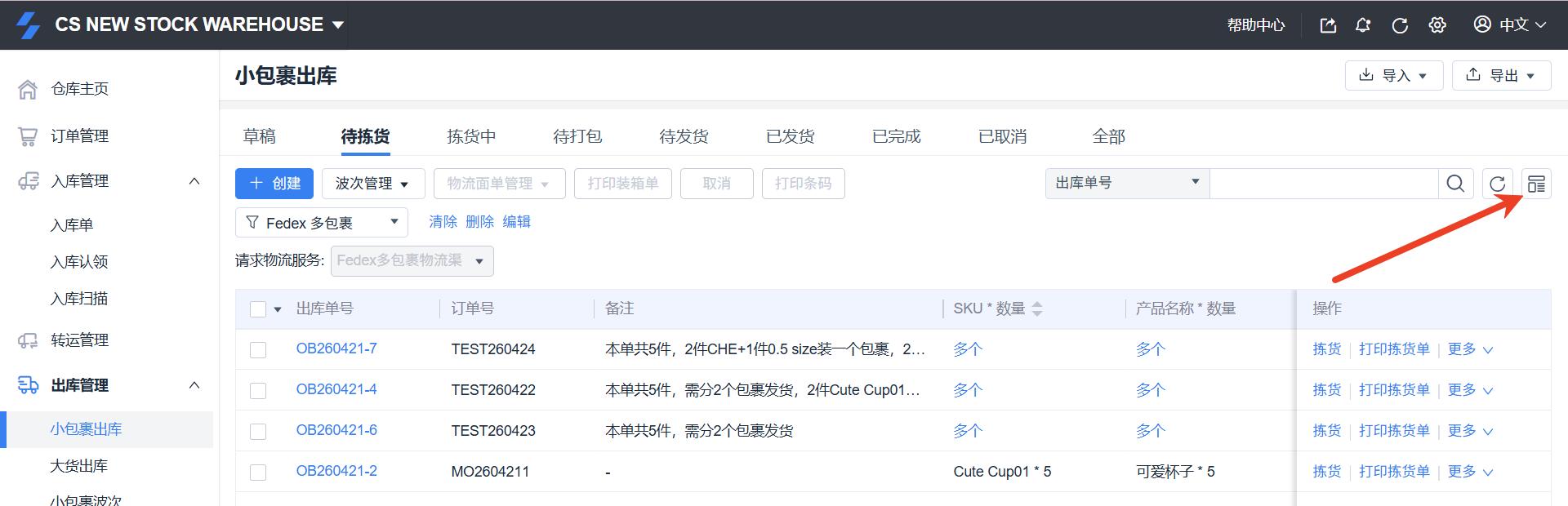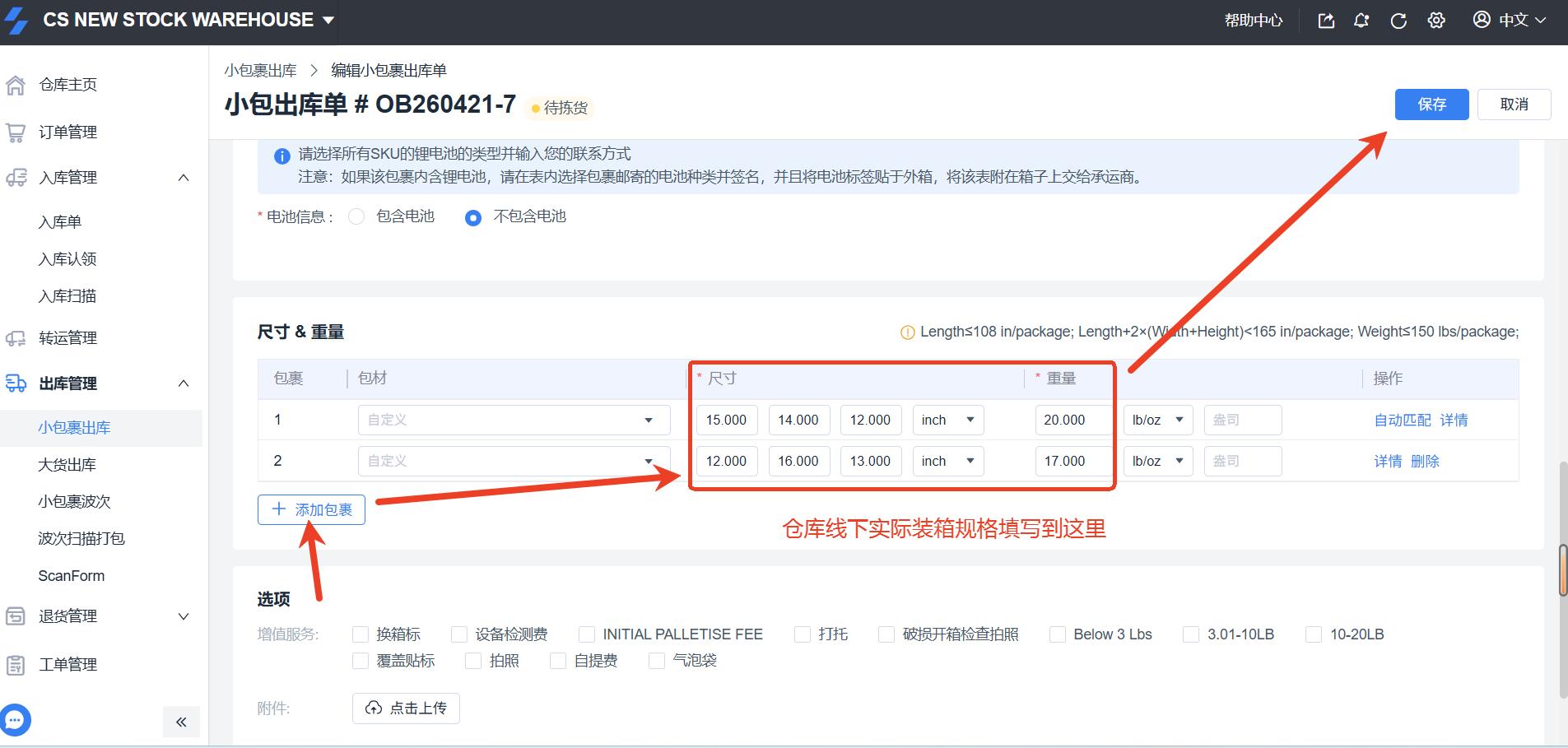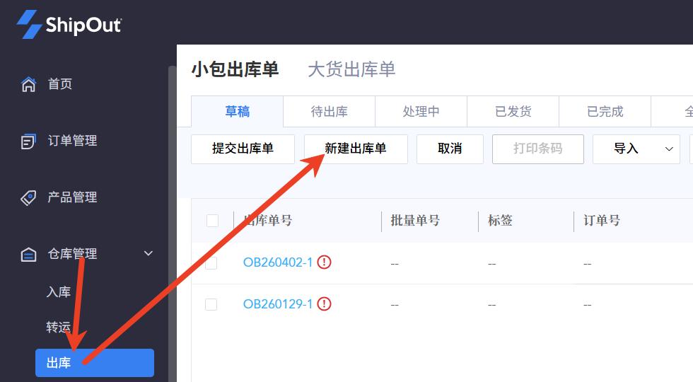 ShipOut 一单多包裹出库操作手册 一、适用场景 当客户一个订单需要分为多个包裹发货时使用,例如:多SKU组合发货单SKU数量较多需分箱客户指定装箱规则(如:2个SKU/箱) 二、操作流程 1. 物流渠道配置(WMS)路径:WMS系统 → 右上角设置 → 物流服务设置 →物流服务设置→管理物流服务→渠道设置→创建渠道 操作步骤:创建一个“多包裹面单专用渠道”,配置可查看该渠道的客户范围和运费计算方式。保存后进入自动化规则配置:选择执行的物流服务 + 账号【重要】关闭“出库单提交时是否生成物流面单?”(选择:否) 2. OMS 创建出库单路径:OMS系统 → 订单管理 / 小包裹出库单 → 创建出库发货 操作要求:选择第一步创建的“多包裹渠道”在备注中明确:装箱规则(例:2个SKU/包裹)或总包裹数要求示例备注:本单共5件,需分2个包裹发货 3. 仓库筛选订单路径:WMS系统→ 出库管理 → 小包裹出库→ 待拣货→筛选“请求物流服务”=多包裹发货的订单 4. 查看客户装箱要求 建议设置:在【表头管理】中设置“备注”字段显示作用:👉 仓库可直接看到客户的分包要求等其他信息 5. 确认包裹数量根据:客户备注要求实际SKU数量仓库装箱规范确定:👉 本单需要拆分的包裹数量 6. 编辑出库单(核心步骤)操作路径:点击出库单右侧操作按钮 → 选择“编辑” 操作内容:修改【包裹数量】按实际装箱填写每个包裹:尺寸(长/宽/高)和重量点击:👉 右上角【保存】 8. 创建多包裹面单操作1:点击出库单右侧的操作按钮,选择“创建物流面单”操作2:勾选出库单左侧选择框,点击上方的批量操作按钮“物流面单管理”,选择“创建物流面单”结果:👉 系统将按设置生成多个包裹运单 Still stuck? How can we help? Was this page helpful? Yes No How can we help? Send