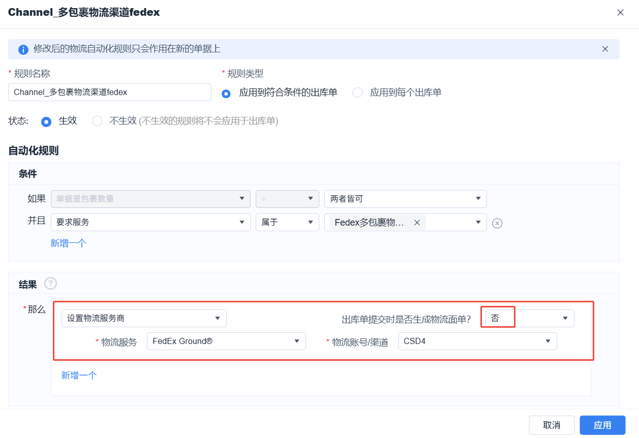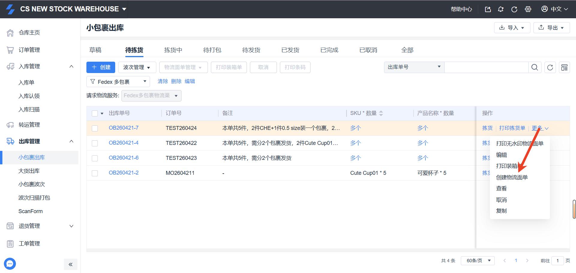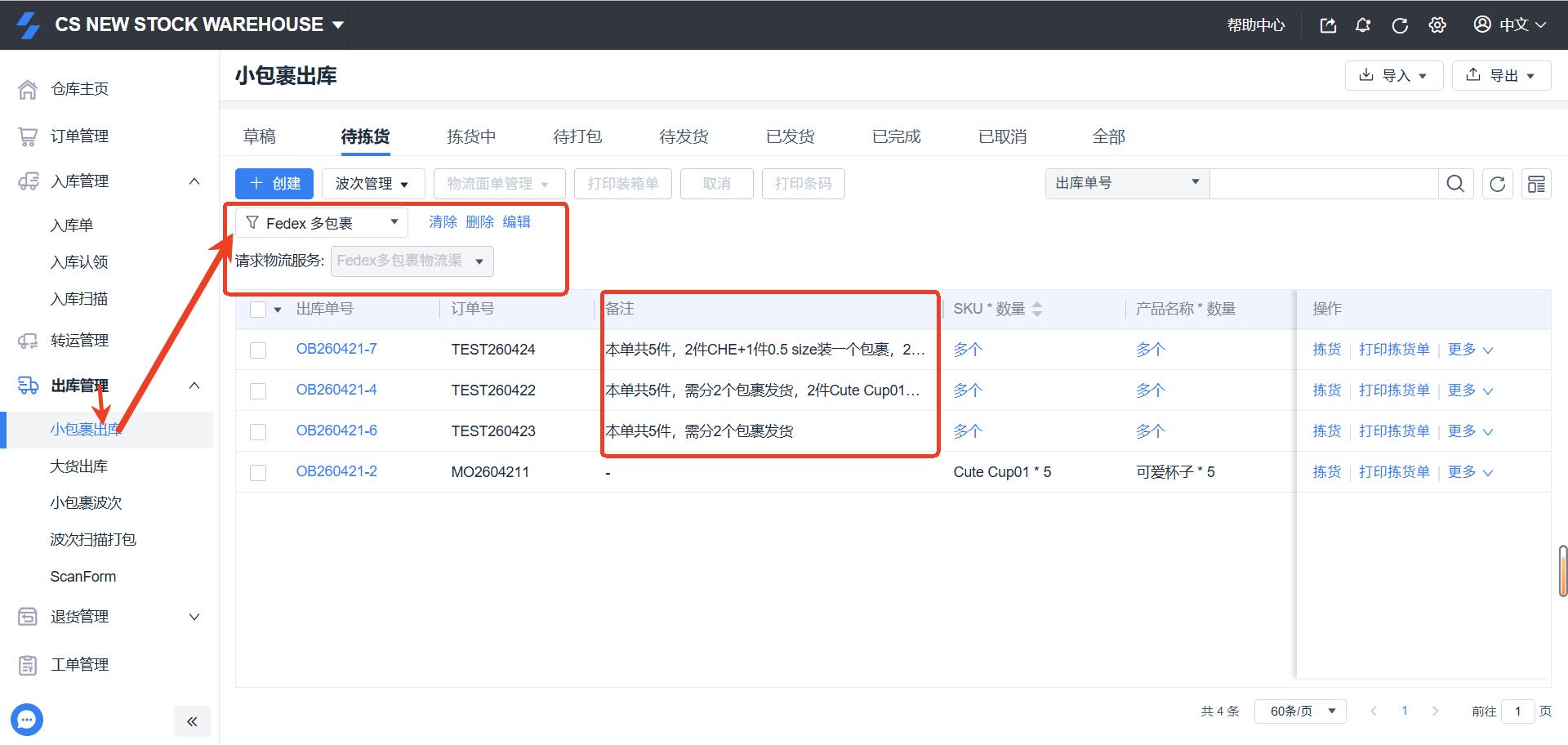 ShipOut 一单多包裹出库操作手册 一、适用场景 当客户一个订单需要分为多个包裹发货时使用,例如:多SKU组合发货单SKU数量较多需分箱客户指定装箱规则(如:2个SKU/箱) 二、操作流程 1. 物流渠道配置(WMS)路径:WMS系统 → 右上角设置 → 物流服务设置 →物流服务设置→管理物流服务→渠道设置→创建渠道 操作步骤:创建一个“多包裹面单专用渠道”,配置可查看该渠道的客户范围和运费计算方式。保存后进入自动化规则配置:选择执行的物流服务 + 账号【重要】关闭“出库单提交时是否生成物流面单?”(选择:否) 2. OMS 创建出库单路径:OMS系统 → 订单管理 / 小包裹出库单 → 创建出库发货 操作要求:选择第一步创建的“多包裹渠道”在备注中明确:装箱规则(例:2个SKU/包裹)或总包裹数要求示例备注:本单共5件,需分2个包裹发货 3. 仓库筛选订单路径:WMS系统→ 出库管理 → 小包裹出库→ 待拣货→筛选“请求物流服务”=多包裹发货的订单 4. 查看客户装箱要求 建议设置:在【表头管理】中设置“备注”字段显示作用:👉 仓库可直接看到客户的分包要求等其他信息 5. 确认包裹数量根据:客户备注要求实际SKU数量仓库装箱规范确定:👉 本单需要拆分的包裹数量 6. 编辑出库单(核心步骤)操作路径:点击出库单右侧操作按钮 → 选择“编辑” 操作内容:修改【包裹数量】按实际装箱填写每个包裹:尺寸(长/宽/高)和重量点击:👉 右上角【保存】 8. 创建多包裹面单操作1:点击出库单右侧的操作按钮,选择“创建物流面单”操作2:勾选出库单左侧选择框,点击上方的批量操作按钮“物流面单管理”,选择“创建物流面单”结果:👉 系统将按设置生成多个包裹运单 Still stuck? How can we help? Was this page helpful? Yes No How can we help? Send