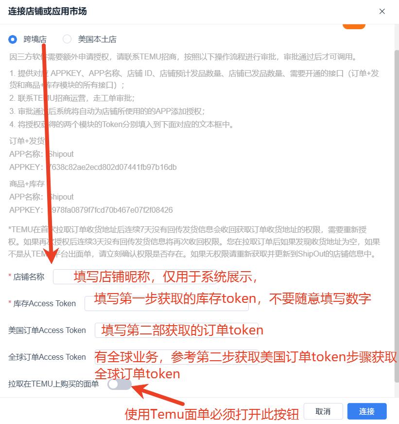 如何在ShipOut链接Temu 跨境店铺? 本文将指导您如何在ShipOut系统中成功集成Temu跨境店铺,实现订单与库存的自动同步,提升运营效率。 一、前提条件 开通权限:请联系ShipOut客服免费开通。适用范围:本文适用于美国跨境店铺(非美国本土店),如需集成Temu美国本土店铺,请查看手册:《如何在ShipOut链接Temu美国本土店铺?》 二、获取Temu授权Token 1、获取库存Token登录Temu跨境卖家中心(页面左上角),点击“订单管理”;根据店铺实际运营业务范围,选择【美国】、【全球(除美国、欧区】进入Seller Center点击“服务市场”的”授权管理” 点击“授权管理(商品)”>”获取授权”>选择ShipOut; 授权时显示”不支持在线call面单“ 请不用担心,这个提示不是报错,只是告知,授权后需要先在Temu上在线下单发货,将物流运单买好,再同步到ShipOut系统内。 × Dismiss alert 全选常规授权和特殊授权,勾选同意协议,点击确认; 复制生成的Access token,保存下来,用于填写到ShipOut链接时的库存token。 2、获取订单token点击“授权管理(订单)”>”获取授权”>选择ShipOut; 全选常规授权和特殊授权,勾选同意协议,点击确认; 复制生成的Access token,保存下来,用于填写到ShipOut链接时的订单token 三、在ShipOut系统中对接Temu店铺 1、登录ShipOut 系统OMS访问oms.shipout.com;自营仓登录wms.shipout.com;系统右上角设置=> 选择电商店铺授权=> 点击链接店铺或应用市场=> 选择Temu Logo 2、进入店铺授权页面点击右上角头像选择“电商店铺授权”选择链接店铺或应用市场 3、选择Temu平台在平台列表找到并点击Temu图标 4、填写授权信息输入自定义的店铺名称(用于系统内区分店铺)复制之前获取的库存Access Token和订单Access Token根据选择打开“拉取在Temu上购买的面单”按钮点击链接完成对接 四、验证Temu店铺链接状态 1、同步订单点击右上角的“同步店铺订单”按钮。=>拉单成功即可看到同步订单数量=>前往左侧订单管理=>待处理状态下查看所有拉到ShipOut的Temu订单。 2、查看订单列表导航至左侧菜单的”订单管理”>“待处理”。确认是否成功获取Temu订单 3、使用Temu店铺面单,需已在Temu操作在线下单发货后操作同步店铺订单。订单状态为【已发货】时,则进入到系统的订单效果如下图会有提示“Temu店铺面单,无需回传”,且订单详情也是显示的Assigned by store代表此时提交出库使用Temu面单; 订单状态为【待发货】时,则进入系统的订单,点击查看详情,寄送服务为”Assigned by store”,代表此时出库使用Temu面单。 五:映射产品关系,将Temu产品和ShipOut的OMS SKU映射(必要步骤) 产品映射是将Temu店铺产品和系统里面产品管理模块创建的SKU做映射关系。将Temu的货品SKU ID或者SKU 货号作为映射店铺别名SKU具体操作可参考手册:如何映射店铺别名? 六:如何获取Temu的快递面单(使用Temu面单必要步骤) 1、链接店铺时已打开【拉取在Temu上购买的面单】按钮 2、操作步骤:必须在Temu上已点击【在线下单发货】购买好Temu快递面单后=>登录ShipOut系统=>点击右上角拉单按钮=>当订单详情寄送服务变成Assigned by store=>再点击提交出库,系统就会将Temu上买好的面单一起拉下来提交给仓库。 特别注意: 3、使用Temu快递面单的建议不要开启ShipOut自动提交出库按钮。4、使用Temu面单的订单进入系统后的收货地址因Temu隐藏该信息,故系统界面全部订单展示为虚拟地址,不影响客户订单发货和时效。 问题一:开启【拉取在Temu上购买的面单】按钮后,为什么已发货状态的单子会进入ShipOut? 因为Temu上点击【在线下单发货】按钮操作购买Temu快递面单后,这个订单的状态会直接从待发货进入到已发货。此时这个单子还需要进入ShipOut发货,所以ShipOut会拉取状态为已发货的Temu订单。出现ShipOut将之前已经发走的Temu订单拉进系统的情况,可直接在ShipOut上勾选这些仓库已发货的订单,点击标记发货后,ShipOut系统将不会再次拉取。当Temu的订单状态进入到【已到达】这个状态就不会被拉进ShipOut。 问题二、如何给Temu店铺仅同步其中一个仓库的库存? 登录链接Temu跨境店铺的账号——>右上角电商店铺授权——>编辑已对接的Temu跨境店铺——>选择仓库映射——将对应的ShipOut仓库的库存选择同步到你选择的temu仓库。 问题三:为什么已经在Temu在线下单发货了,但是系统同步店铺订单,没有识别到是用的店铺面单? Temu订单状态为已发货,但ShipOut未拉到temu面单时,在排除Temu拆单及合单的情况后,可以通过对问题店铺操作重新认证,不需要动任何的字段,直接点击链接后,再次点击右上角同步电商店铺订单解决。 Temu订单是待发货(即延时发货),但ShipOut未拉到Temu面单时,在排除temu拆单及合单的情况后,可以等待10分钟后再重试点击右上角同步店铺订单,可查看系统已识别为使用店铺面单。 Still stuck? How can we help? Was this page helpful? Yes 11 No 4 How can we help? Send